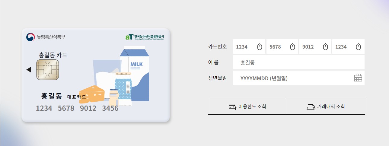 사용하시는 우유바우처카드의 이용한도와 잔액조회 그리고 거래내역을 간편하게 조회할 수 있습니다.