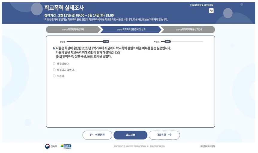 설문조사의 첫 번째 단계로 학교폭력 예방교육 영상을 보게 됩니다.